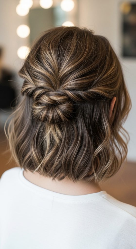 A low mini bun creates a compact and elegant look. It works well for slightly longer short hair.