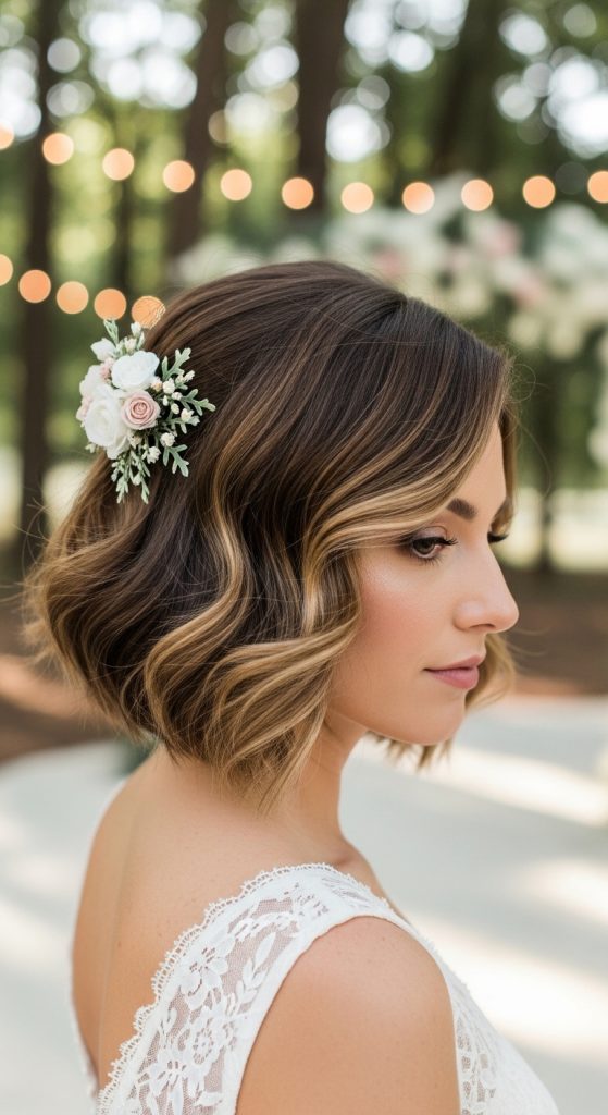Side-swept waves introduce soft movement and asymmetry to short hair. This style creates a gentle flow that enhances facial features while maintaining structure. It is suitable for both formal and outdoor wedding environments.