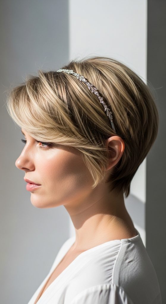 A textured pixie hairstyle with a headband creates a structured and polished look while maintaining simplicity. This style focuses on adding volume and definition to short hair using light texture. The headband acts as both a decorative and functional element, keeping hair in place while enhancing the overall aesthetic. This design aligns with modern minimalist style trends and is suitable for various wedding settings.