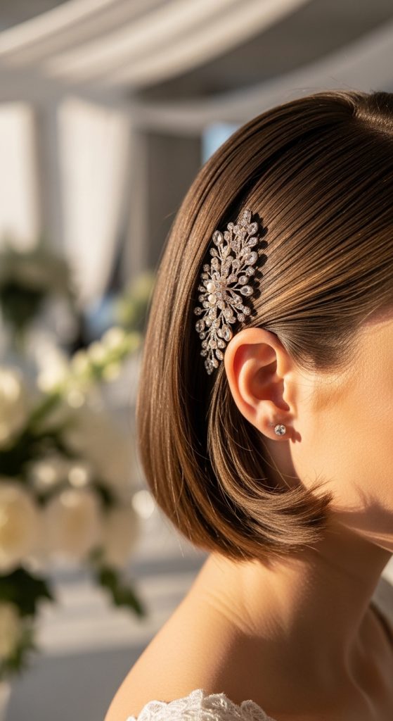Style the hair smoothly and place a clip on one side. Ensure secure placement. Adjust for balance. This method creates an elegant and minimal look.