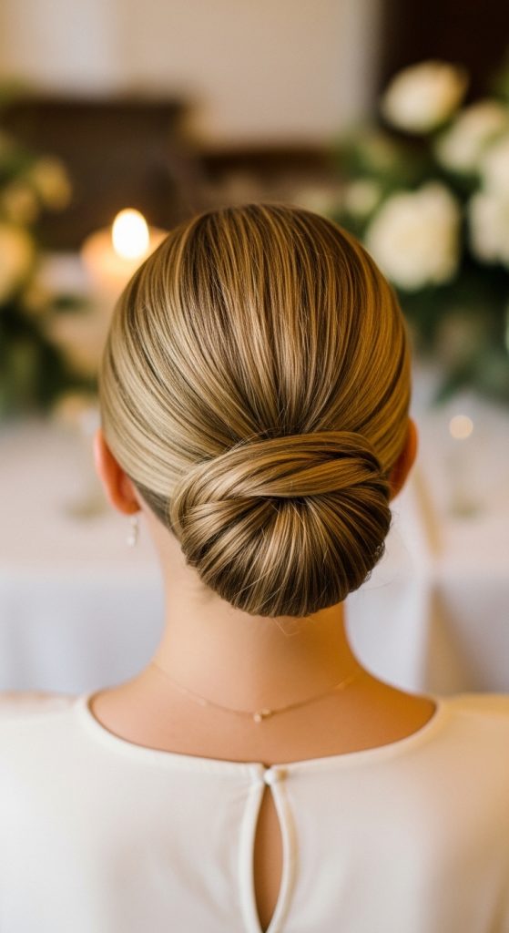 Gather the hair at the back and form a small bun. Secure with pins. Smooth the surface for a clean finish. This method creates a simple and refined style.