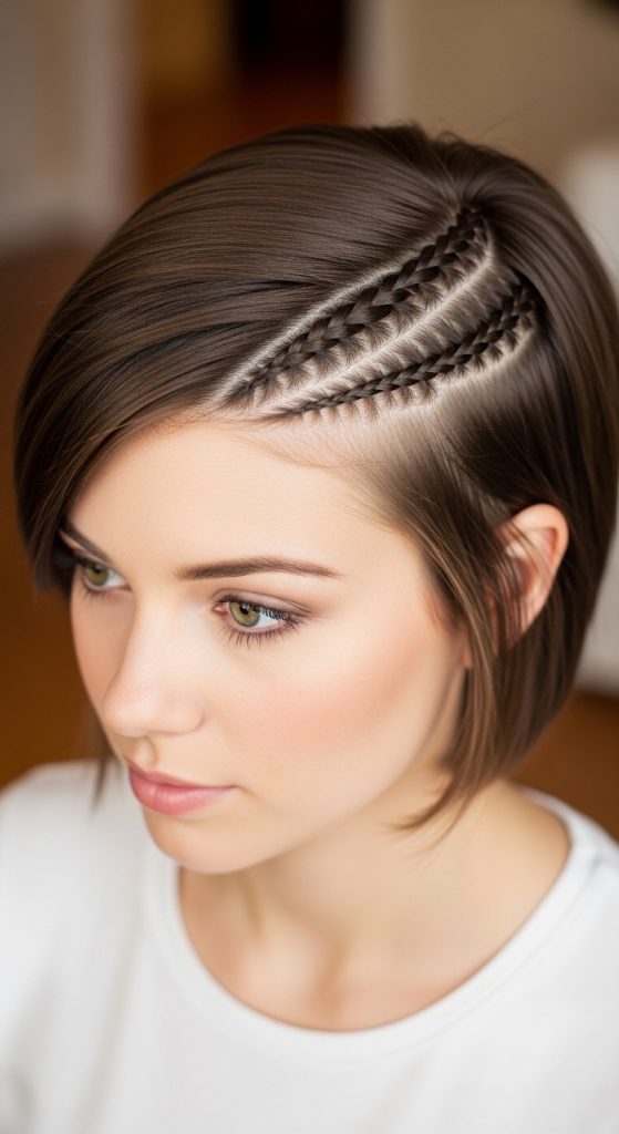 A braided front detail adds structure and decoration to short hair. It keeps the front section organized while adding visual interest.