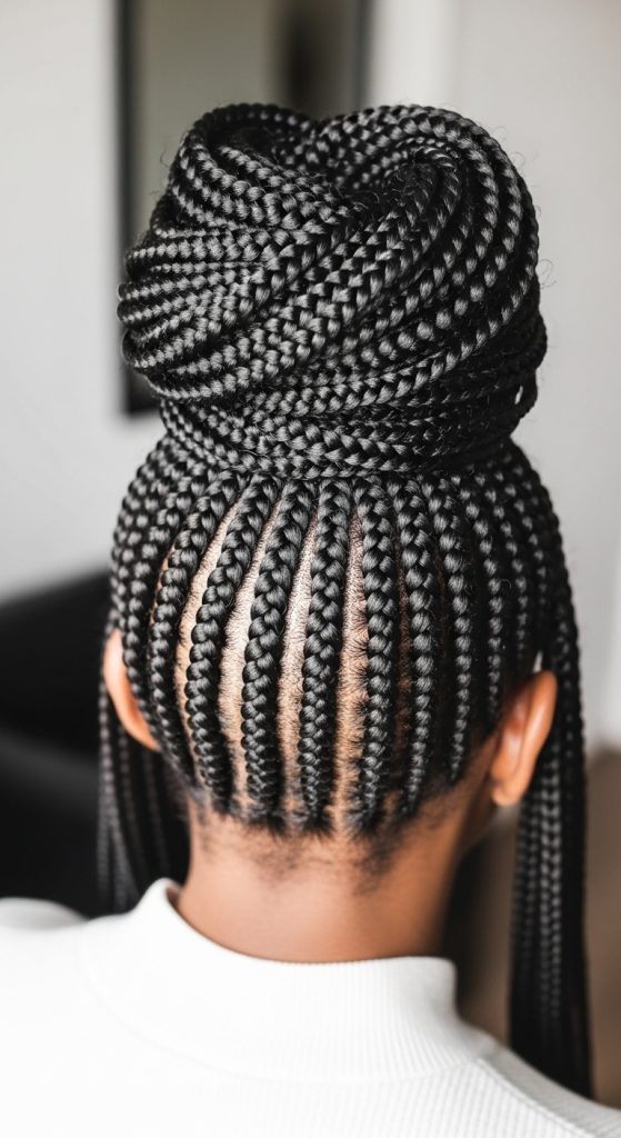 Pinterest inspiration boards frequently feature this hairstyle because the cornrow pattern adds visual structure across the scalp. The braids form clean lines that lead toward the bun, which becomes the focal point of the hairstyle. This style is especially effective for showcasing intricate braid parting patterns.