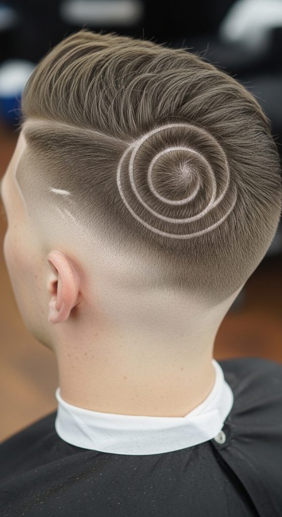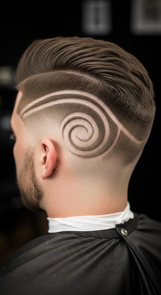 The spiral design creates a swirling pattern carved into the faded section of the haircut.