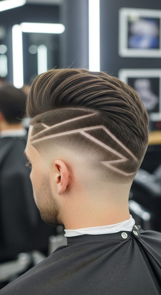 The lightning bolt design introduces a zigzag pattern carved into the faded area of the haircut. This pattern creates a bold visual effect that resembles the shape of a lightning strike. The sharp angles of the design contrast with the smooth fade, making the pattern stand out clearly.