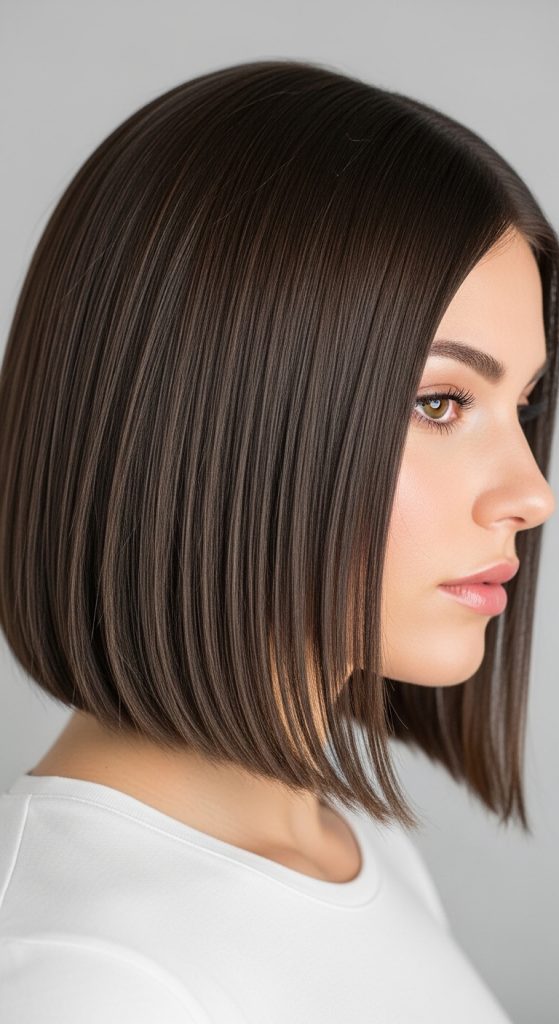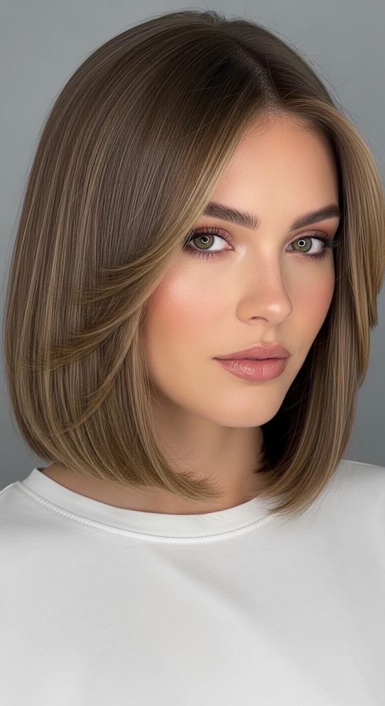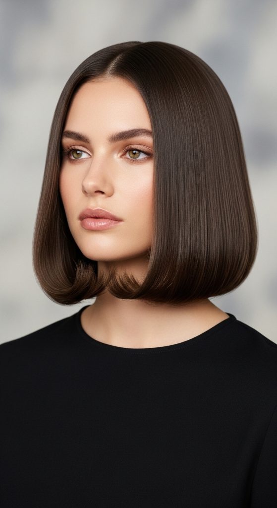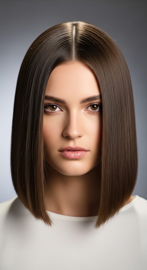 This haircut combines a blunt base with subtle layers around the face. The ends remain evenly cut while shorter pieces near the front frame the face. This design maintains structure while adding softness.