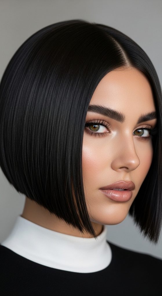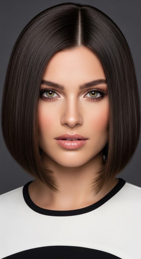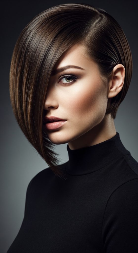 A blunt short cut emphasizes straight edges and sharp lines. This style creates a bold and structured appearance.