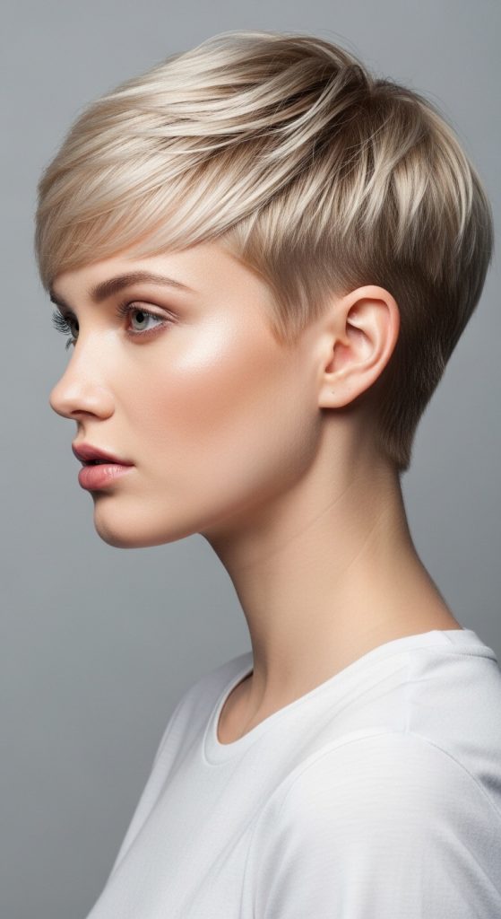 A tapered pixie gradually shortens toward the neckline while leaving volume at the crown.