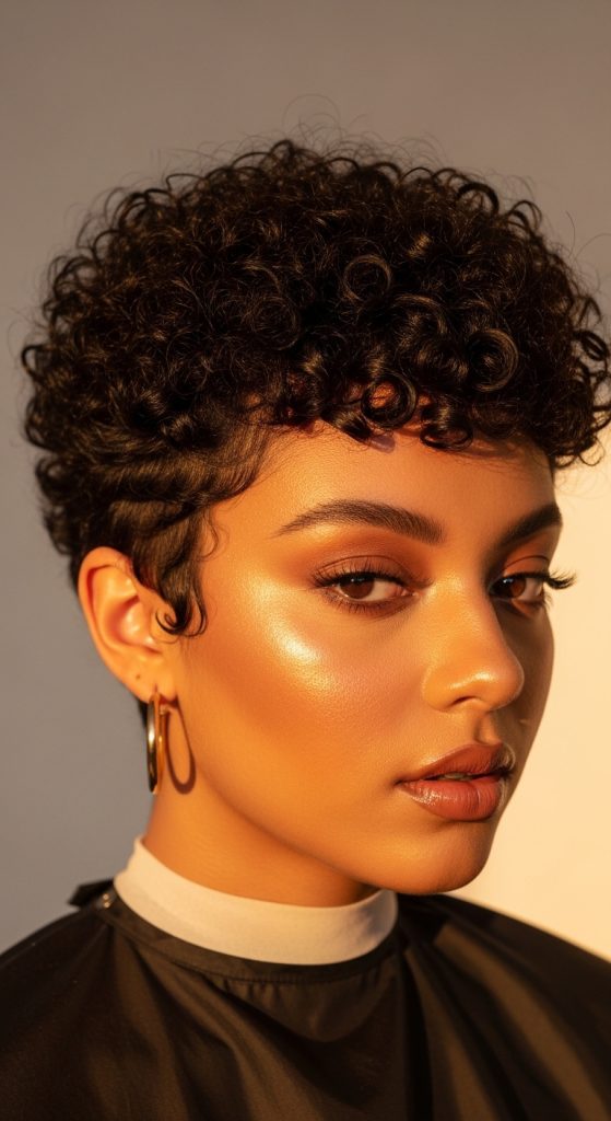 The short curly crop highlights natural curls while maintaining a compact haircut shape.