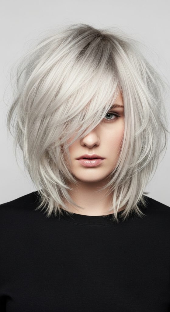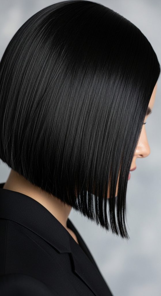 The angled layered bob works particularly well for straight or slightly wavy hair because the diagonal lines remain visible. The haircut also enhances facial definition by directing attention toward the front sections.