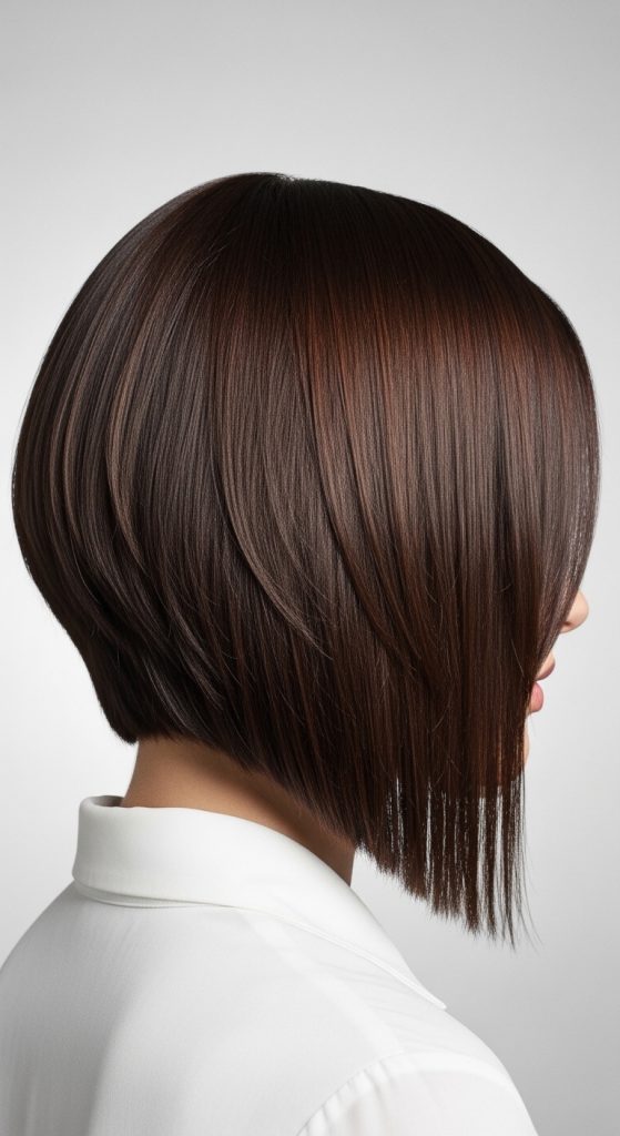 The angled layered bob features a gradual increase in length from the back toward the front of the haircut. The back section remains shorter, while the front pieces extend slightly longer around the jawline. This angled design introduces diagonal lines that create a modern and sophisticated appearance.
