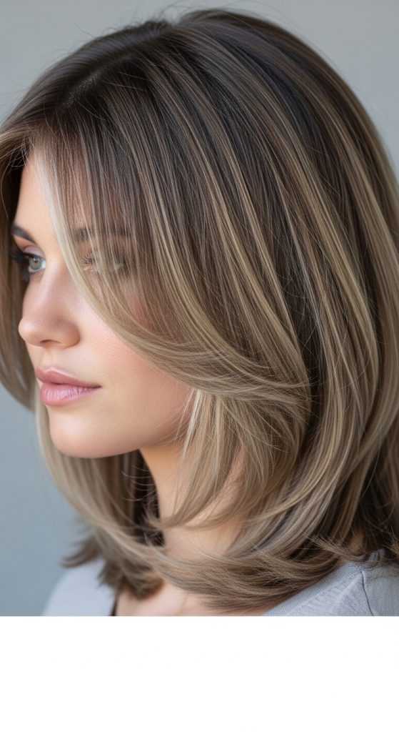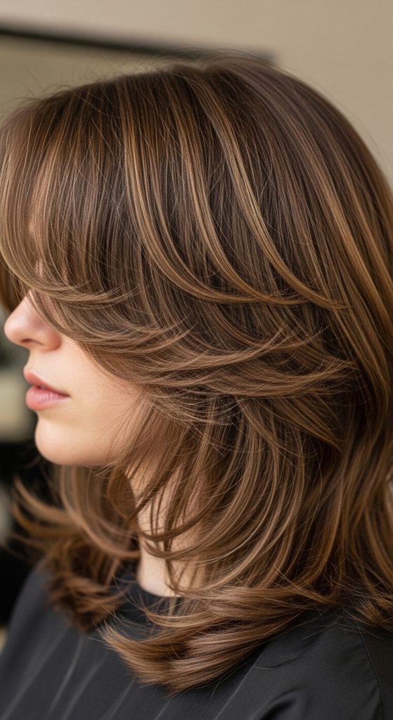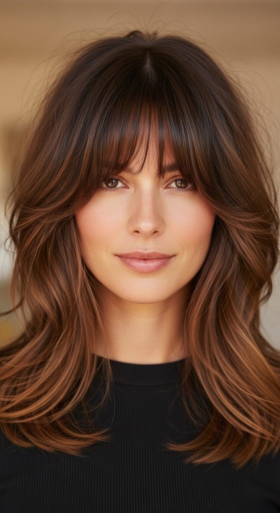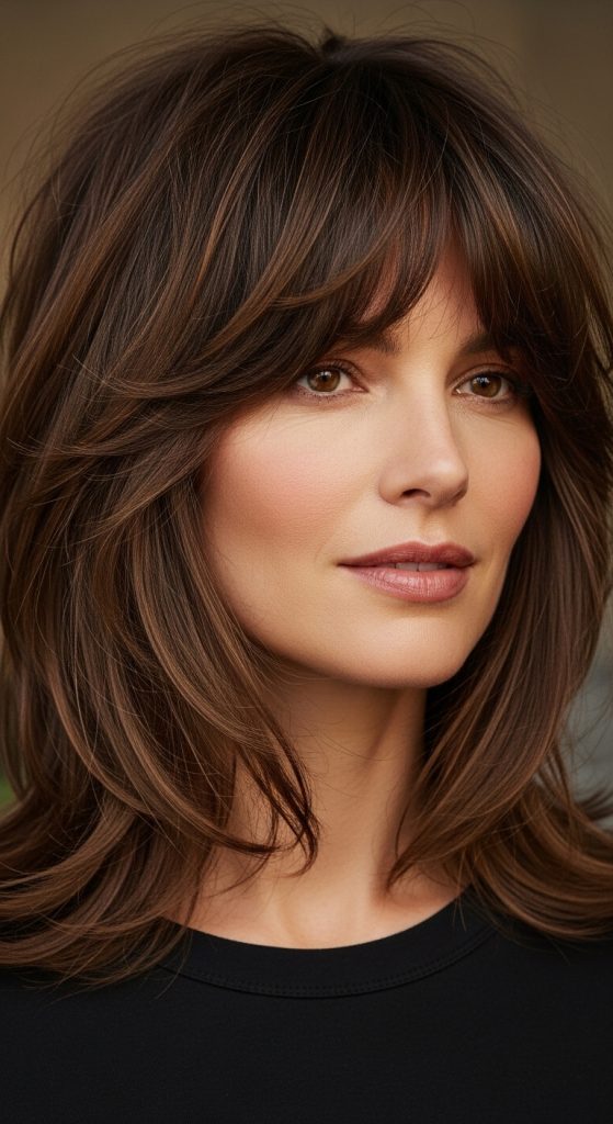 The light bangs create a subtle framing effect. The layers ensure that the haircut remains cohesive and balanced.