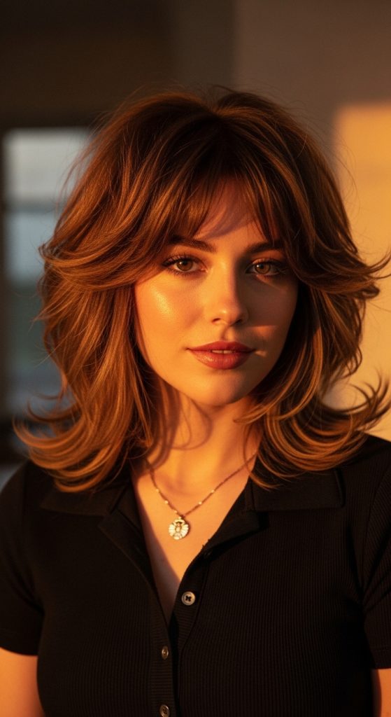 The shag with light bangs introduces a soft fringe that blends into the layered structure. This style reduces density around the face while maintaining overall volume.
