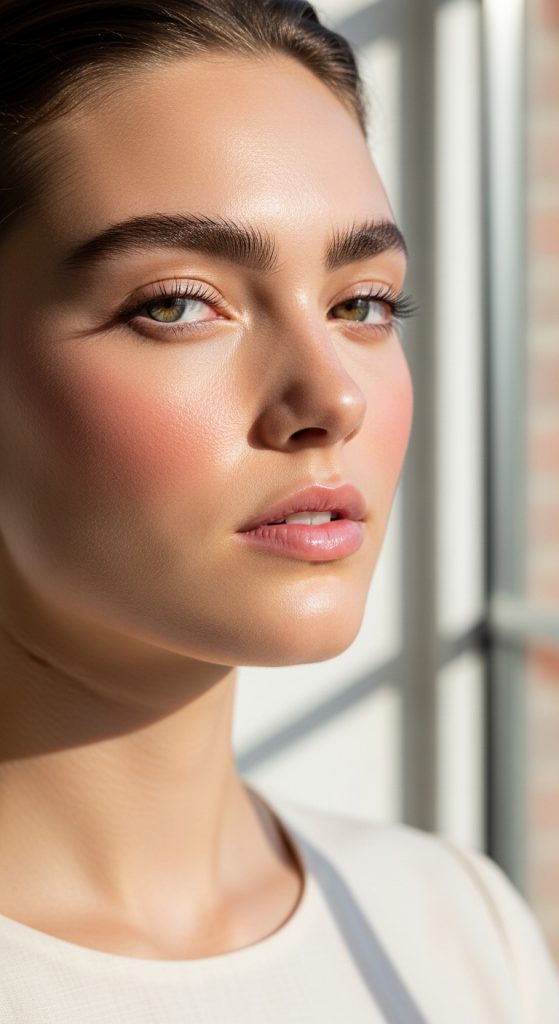 Glowing skin, subtle contour, and high-shine nude lips.