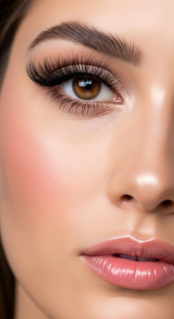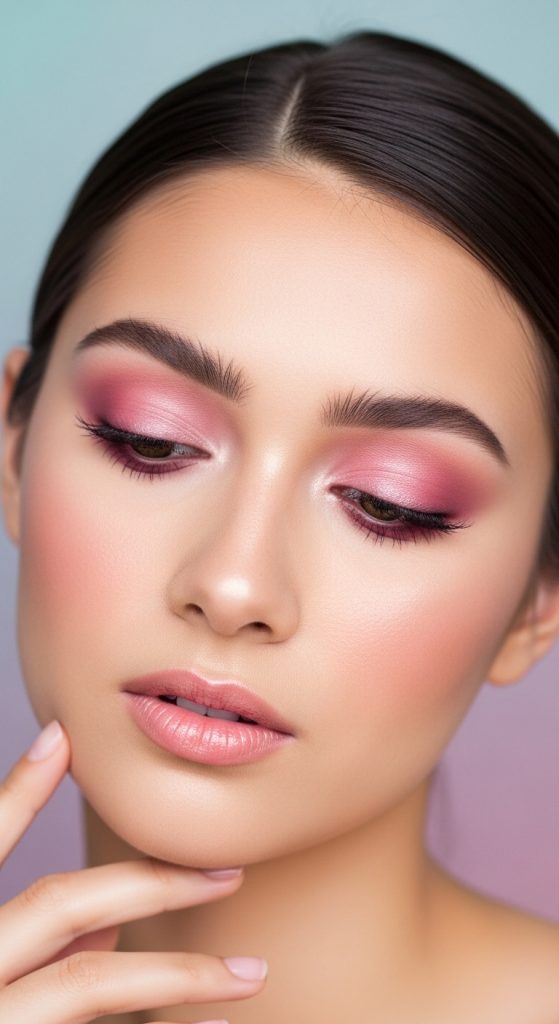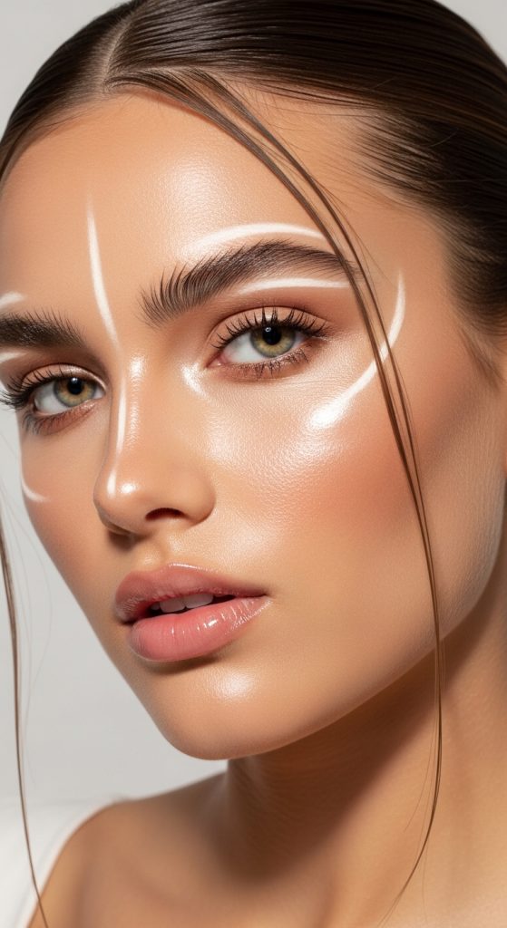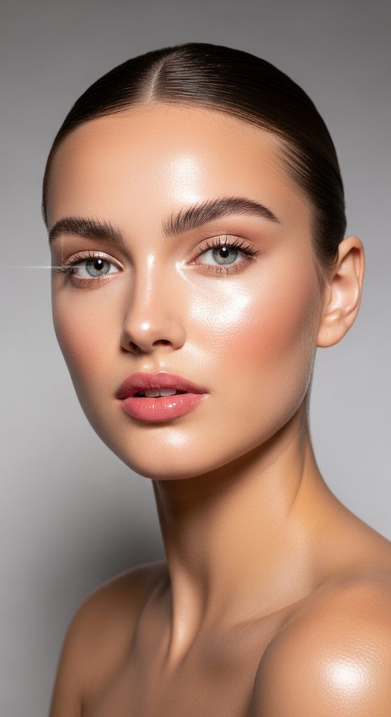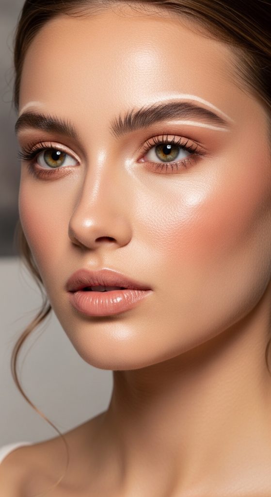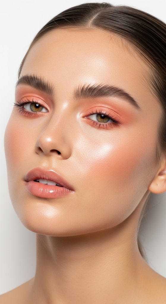 Modern beauty trends have shifted toward skin-first makeup. Pinterest and editorial looks prioritize hydrated, glowing complexions over matte, cakey finishes. Cream products, soft blush placement, glossy highlights, and brushed brows dominate the aesthetic. Natural glam celebrates texture — dewy skin, fluffy lashes, and satin lips create dimension that photographs beautifully.