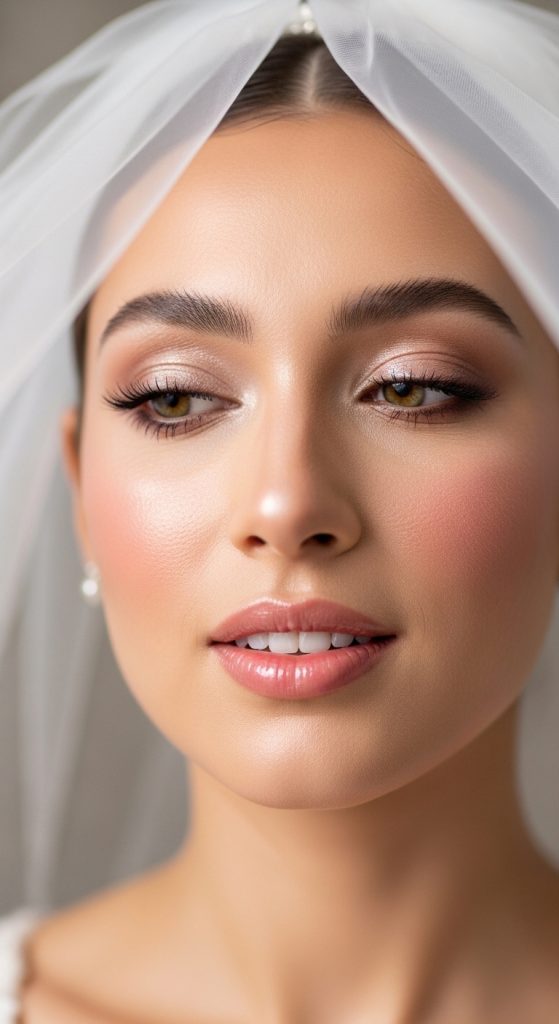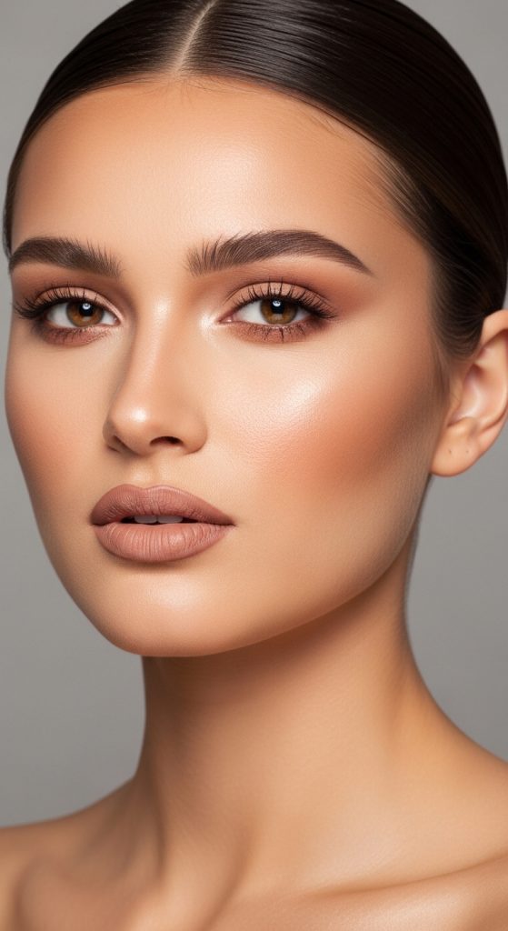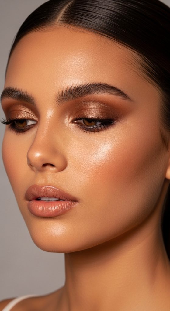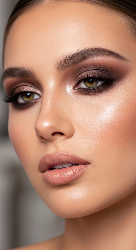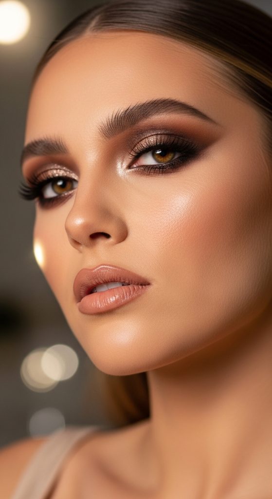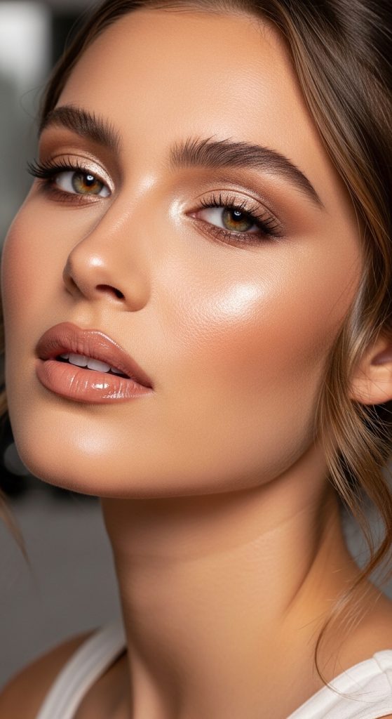 Apply champagne shimmer lightly to the eyelids. Blend a soft taupe into the crease for depth. Add glowing highlighter to cheekbones. Keep lips nude and glossy.