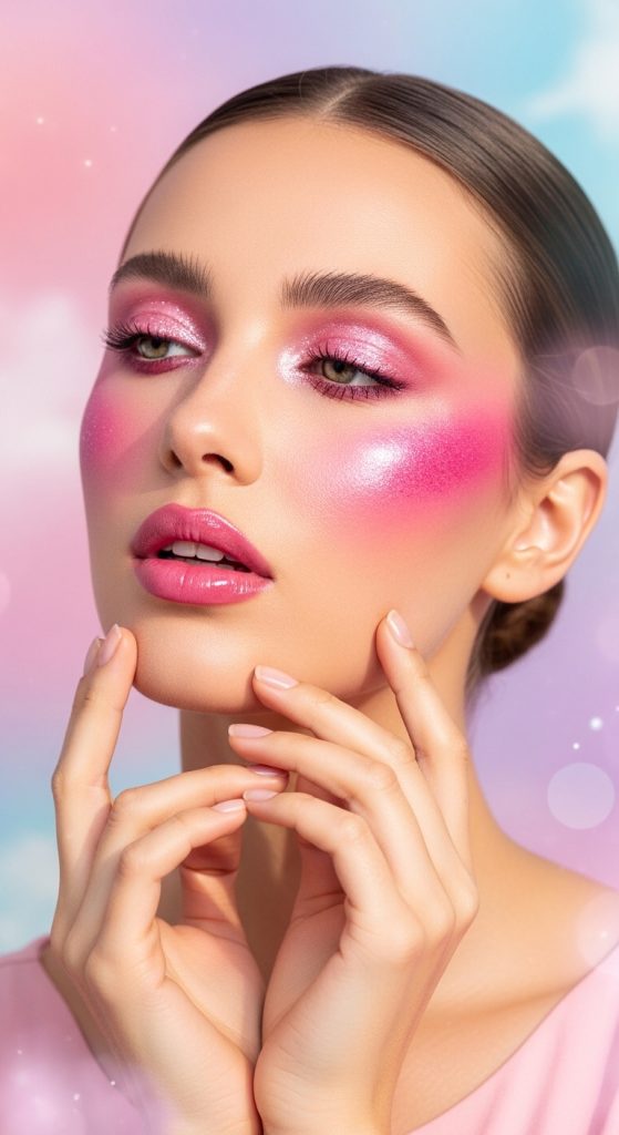 Use pink blush high on cheeks. Add pink shimmer to lids. Finish with pink gloss.