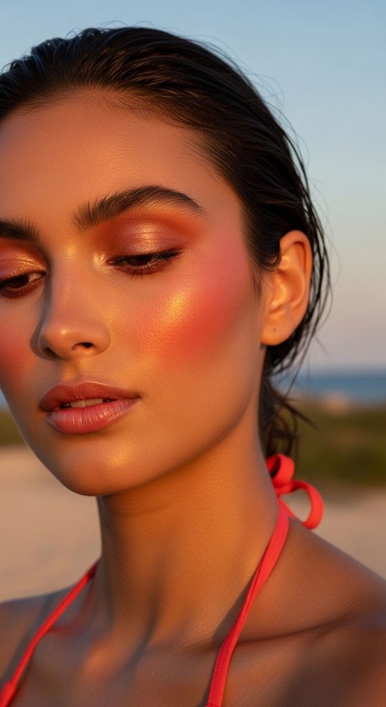 Apply bronzer across cheeks, nose, and temples. Use coral blush. Add warm shimmer to lids. Finish with tinted lip balm.