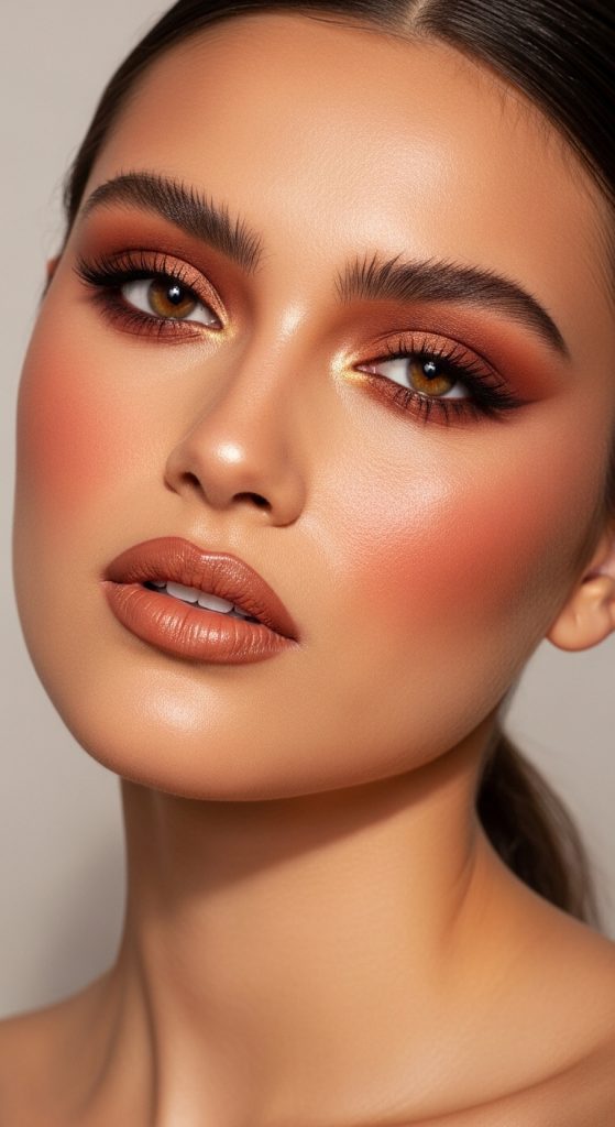 Blend terracotta shadow lightly. Add matching blush. Finish with warm nude lip.